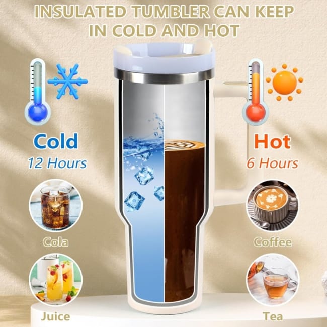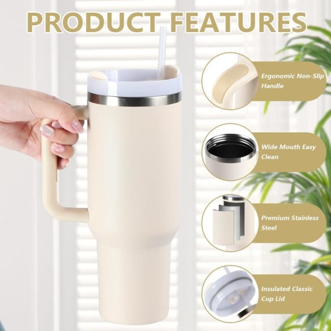 Stainless Steel Tumbler Hot And Cold With Handle & Lid 2 Straw, Double Insulated Cup FW